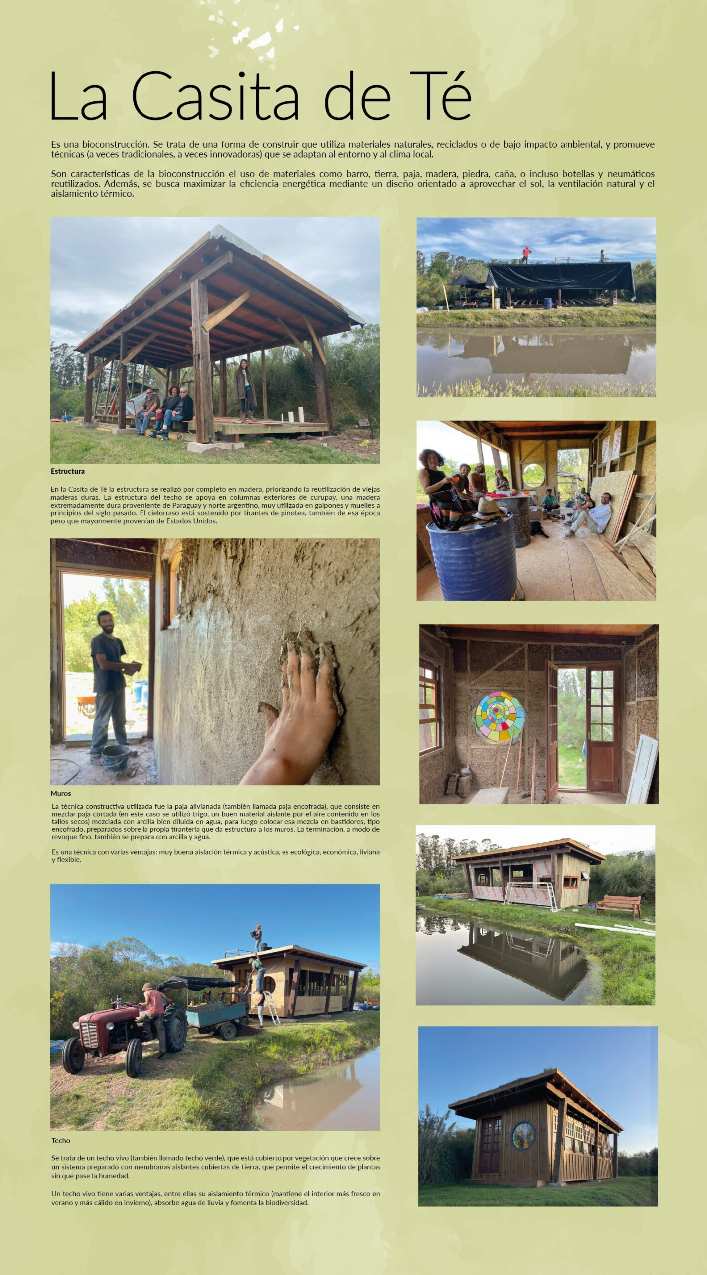 La “Casita de Té” es una bioconstrucción (barro, madera, techo vivo) donde recibimos a las visitas, junto a un fogón al aire libre, varios rincones para el juego de niñas y niños, un espacio didáctico sobre la producción ecológica de nueces pecan …