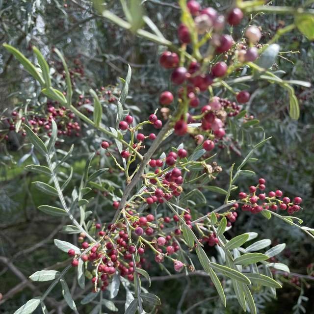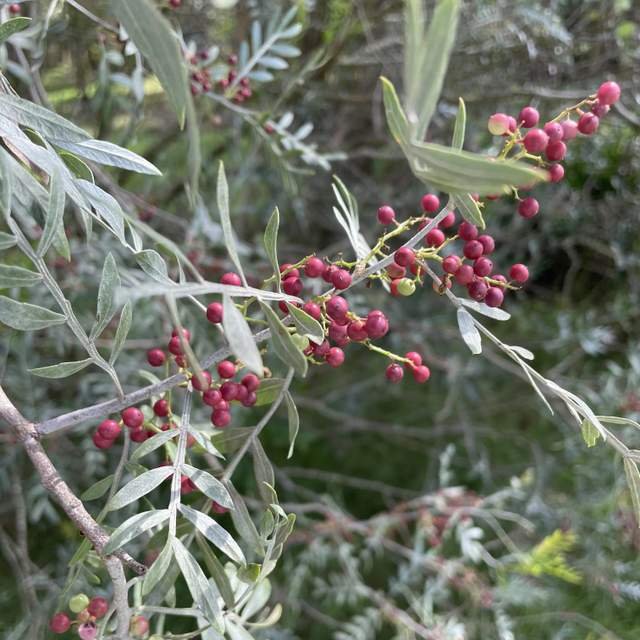 Árbol relativamente bajo y forma globosa, con hojas de color gris claro que dan un destaque visual interesante en contraste con el verde del monte.